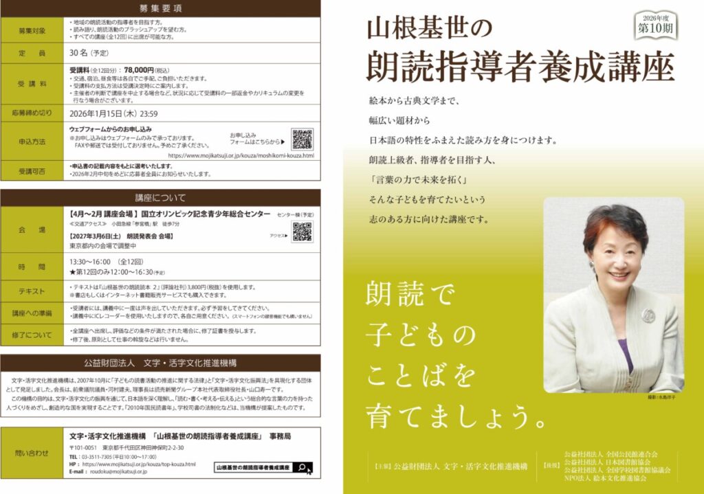 「朗読指導者・読書活動推進者のための勉強会」(大人向けセミナー)では、講師に山根基世さん(アナウンサー・朗読指導者養成講座講師)をお招きし、朗読や読み聞かせのスキルアップになるプログラムを予定しております。また、フリーアナウンサーで、山根基世の朗読指導者養成講座第1期修了生の進藤晶子さんが総合司会を務めます。プログラムの最後には、NHK交響楽団の後藤康さん(ヴァイオリニスト)、小畠幸法さん(チェリスト)によるミニ演奏会も。地域やこれからの読書活動にぜひお役立てください。